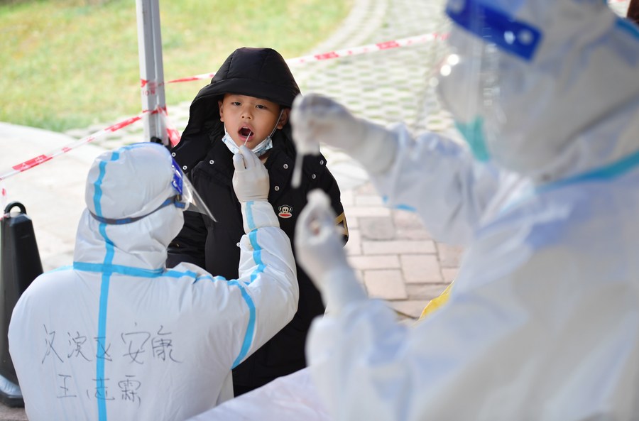 A medical worker collects a swab sample from a child at a COVID-19 testing site in Xi'an, northwest China's Shaanxi Province, Dec. 21, 2021. (Xinhua/Shao Rui)