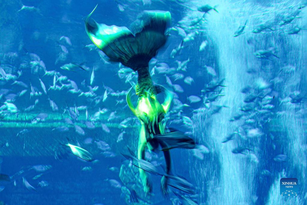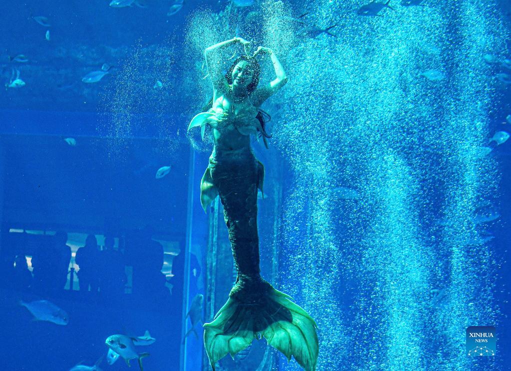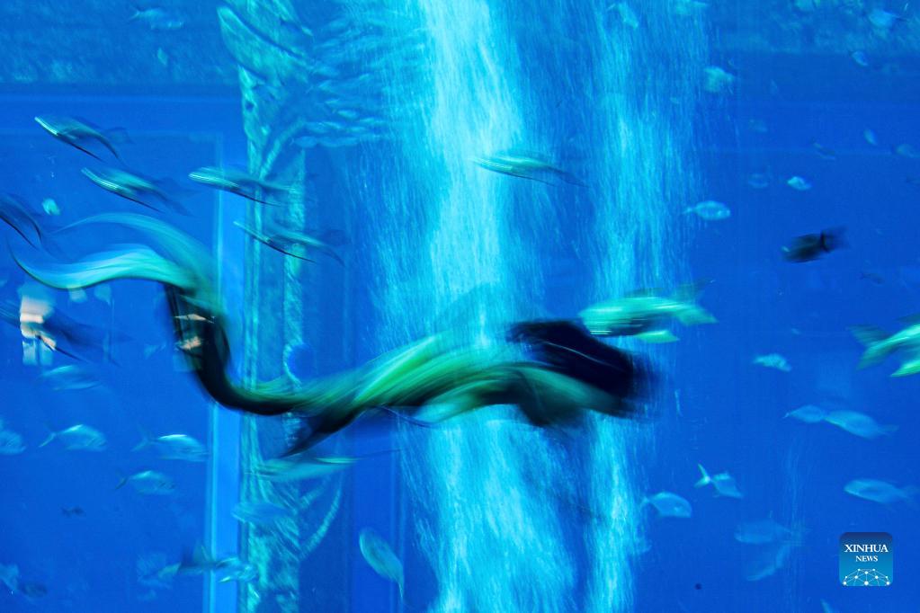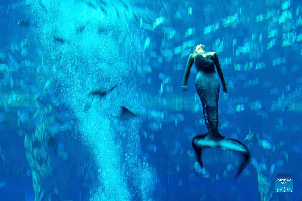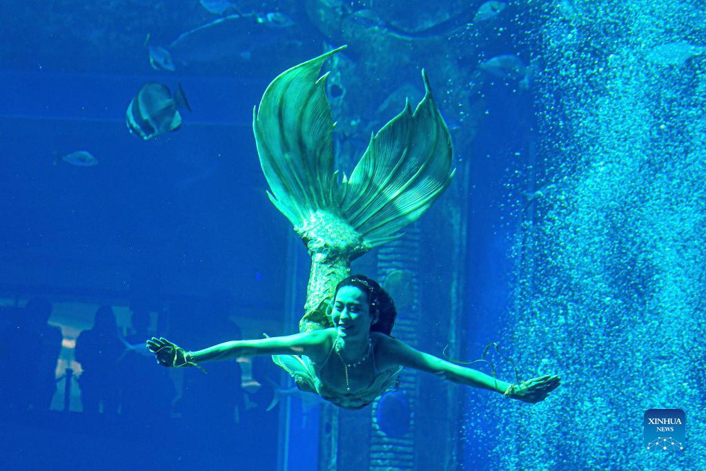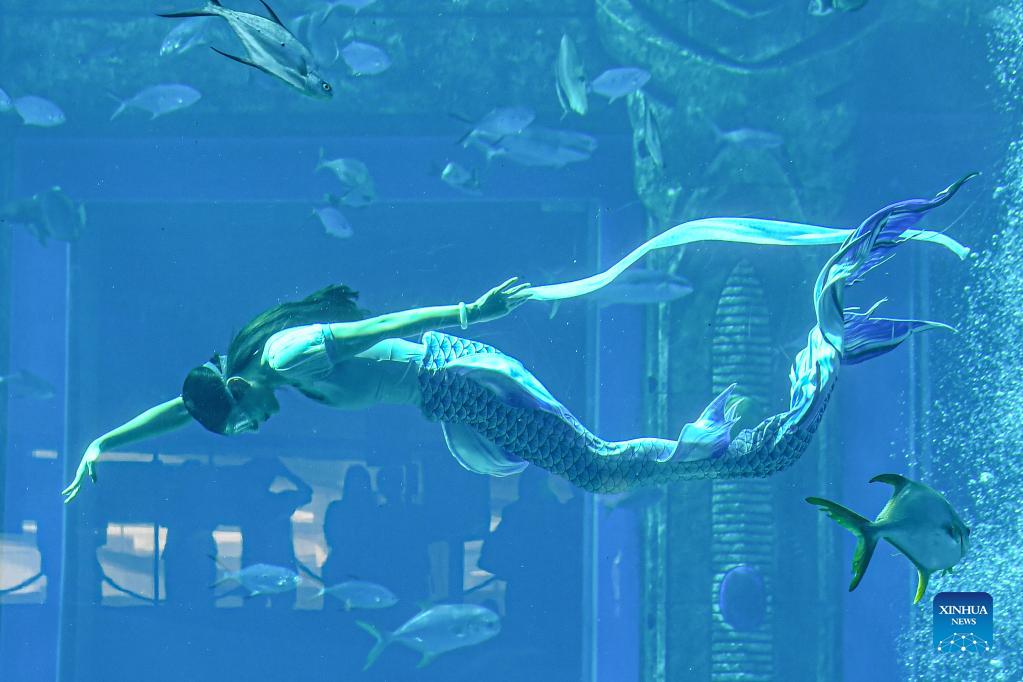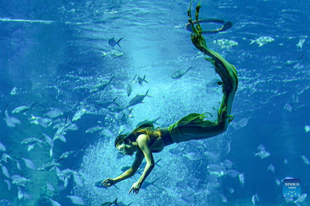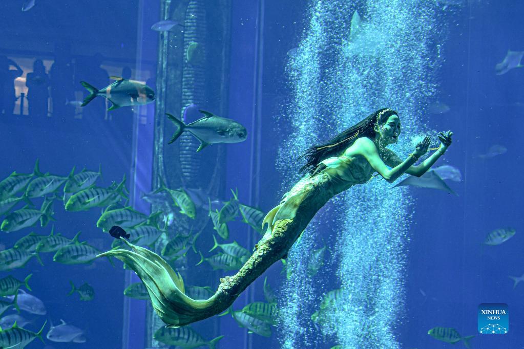 A contestant participates in the final of China's First Mermaid Performance Contest in Sanya, south China's Hainan Province, Dec. 22, 2021. The event, the first national-level professional mermaid competition, was held at Atlantis Sanya in Hainan. (Xinhua/Pu Xiaoxu)