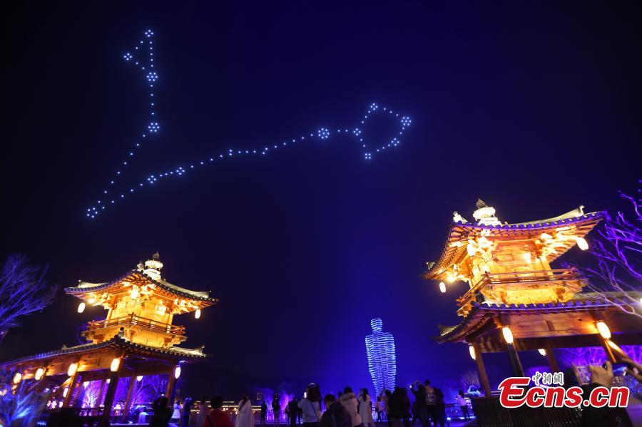 A light show with drones is staged at Nianhua Bay in Wuxi, east China's Jiangsu province, Dec. 22, 2021. (Photo: China News Service/Yang Bo)