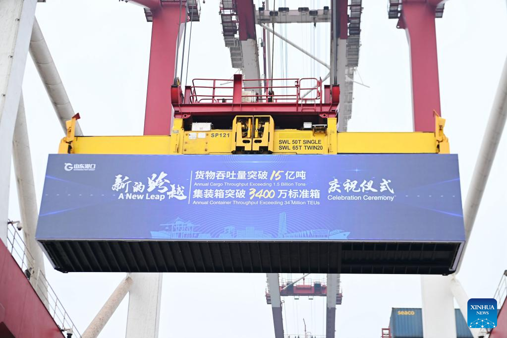 Photo taken on Dec. 23, 2021 shows a container lifted at the Qianwan Container Terminal in Qingdao, east China's Shandong Province. Shandong Port Group held a ceremony in Qingdao Port on Thursday, celebrating its annual cargo throughput exceeding 1.5 billion tonnes, while its container throughput surpassing 34 million twenty-foot equivalent units (TEUs). The cargo and container throughput registered year-on-year growth of 5.8 percent and 8.1 percent respectively in 2021. (Photo by Yu Fangping/Xinhua)