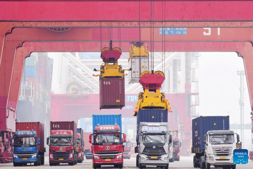 Photo taken on Dec. 23, 2021 shows containers loaded at the Qianwan Container Terminal in Qingdao, east China's Shandong Province. Shandong Port Group held a ceremony in Qingdao Port on Thursday, celebrating its annual cargo throughput exceeding 1.5 billion tonnes, while its container throughput surpassing 34 million twenty-foot equivalent units (TEUs). The cargo and container throughput registered year-on-year growth of 5.8 percent and 8.1 percent respectively in 2021. (Photo by Yu Fangping/Xinhua)