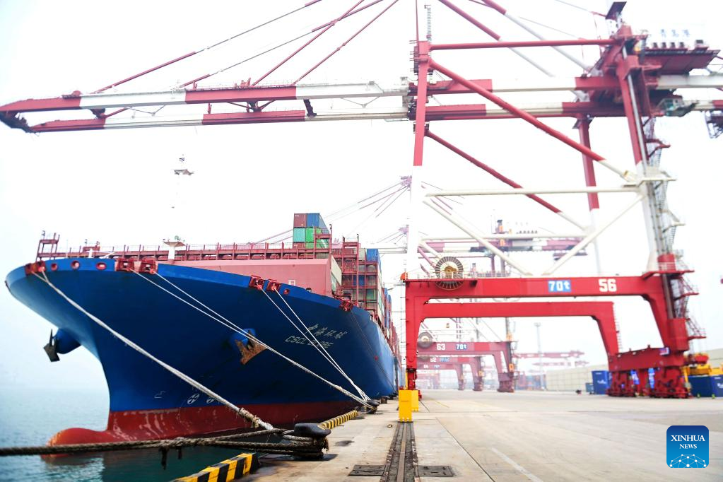 Photo taken on Dec. 23, 2021 shows a container vessel docking at the Qianwan Container Terminal in Qingdao, east China's Shandong Province. Shandong Port Group held a ceremony in Qingdao Port on Thursday, celebrating its annual cargo throughput exceeding 1.5 billion tonnes, while its container throughput surpassing 34 million twenty-foot equivalent units (TEUs). The cargo and container throughput registered year-on-year growth of 5.8 percent and 8.1 percent respectively in 2021. (Photo by Yu Fangping/Xinhua)