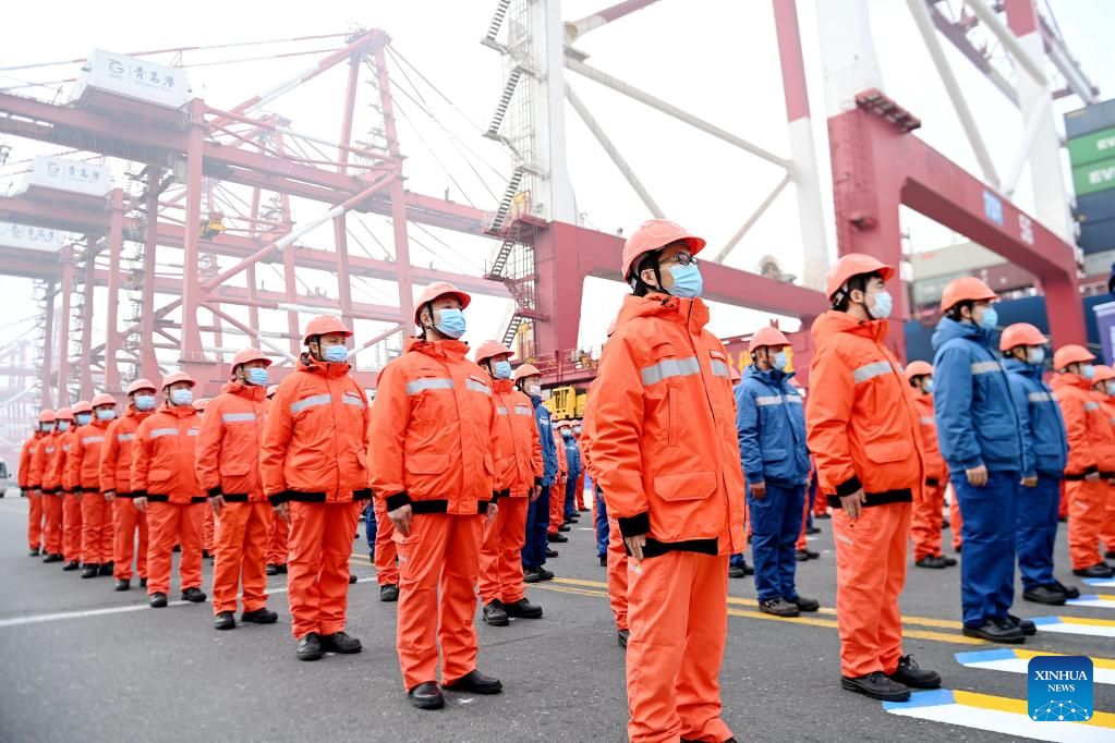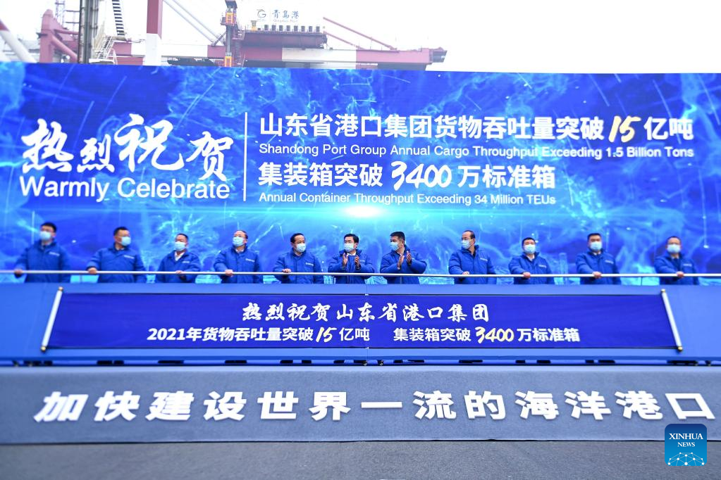 Port staff members and guests attend a celebration ceremony at the Qianwan Container Terminal in Qingdao, east China's Shandong Province, Dec. 23, 2021. Shandong Port Group held a ceremony in Qingdao Port on Thursday, celebrating its annual cargo throughput exceeding 1.5 billion tonnes, while its container throughput surpassing 34 million twenty-foot equivalent units (TEUs). The cargo and container throughput registered year-on-year growth of 5.8 percent and 8.1 percent respectively in 2021. (Photo by Yu Fangping/Xinhua)