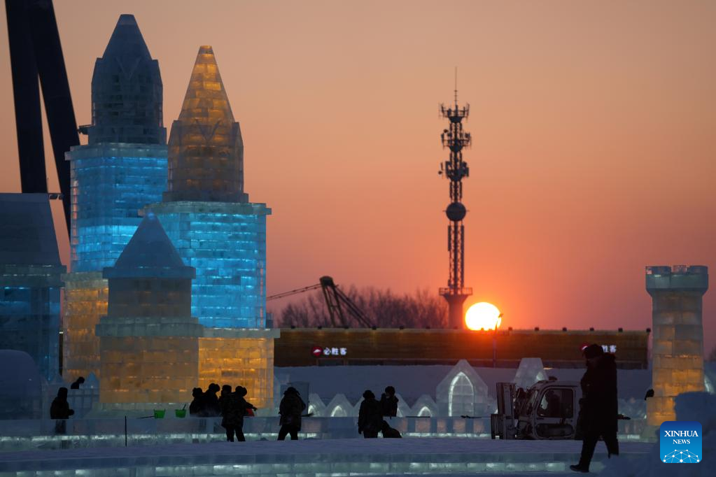 People work at the construction site of the Harbin Ice-Snow World in Harbin, northeast China's Heilongjiang Province, Dec. 23, 2021. The 23rd Harbin Ice-Snow World will open to the public on Saturday. (Xinhua/Wang Jianwei)