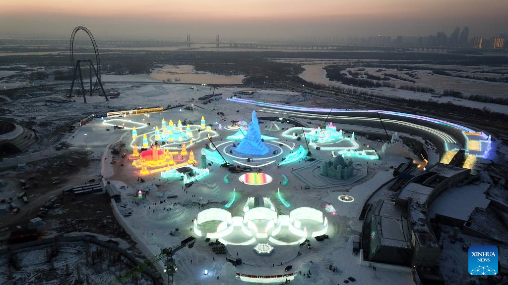 Aerial photo taken on Dec. 23, 2021 shows the construction site of the Harbin Ice-Snow World in Harbin, northeast China's Heilongjiang Province. The 23rd Harbin Ice-Snow World will open to the public on Saturday. (Xinhua/Wang Jianwei)