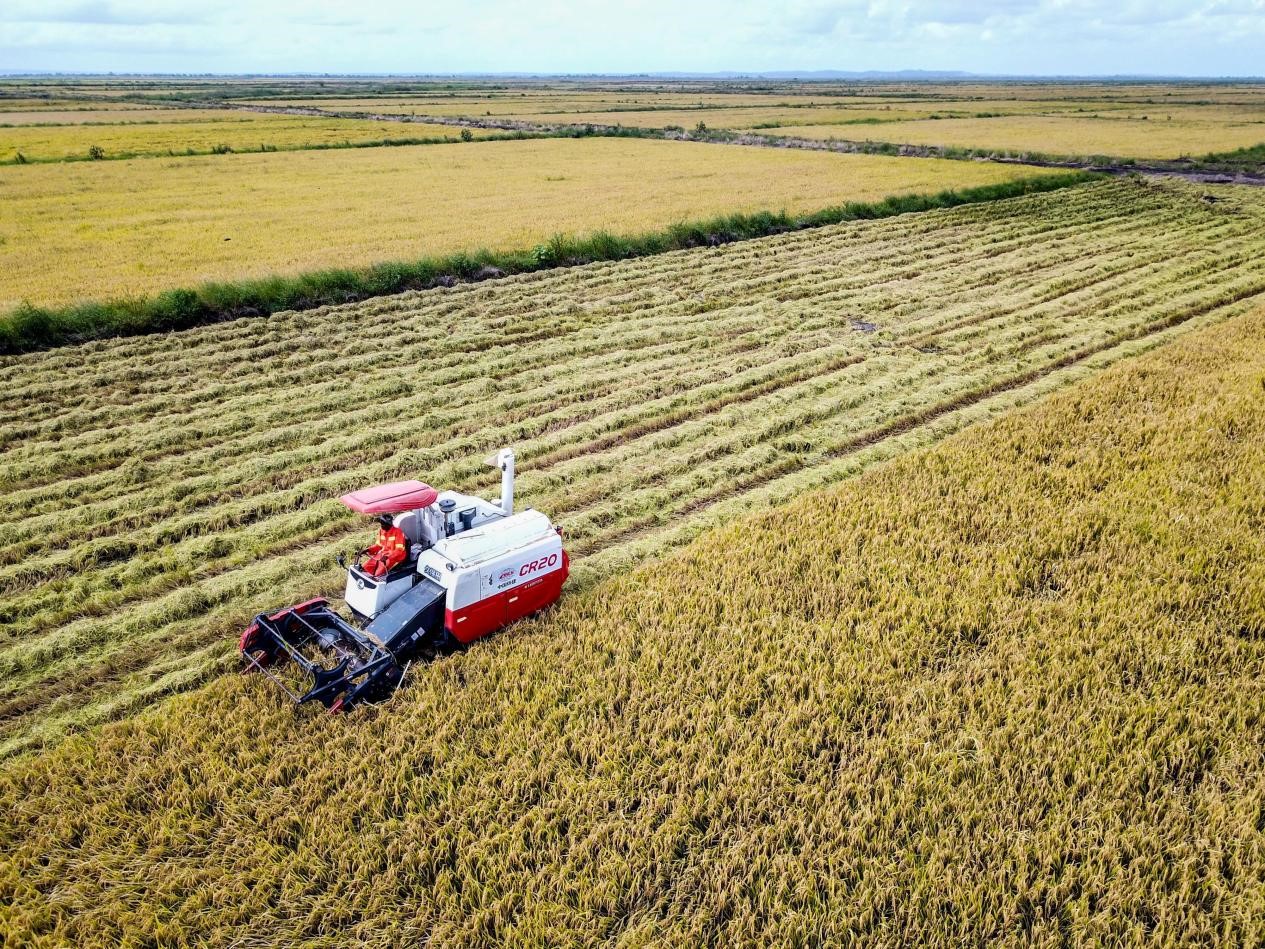 Photo taken in April 2019 shows a harvester collecting rice in a field of the China-Africa Xai-Xai Agricultural Cooperation Project in Xai-Xai city of Mozambique’s Gaza province. (Photo/www.crnews.net)