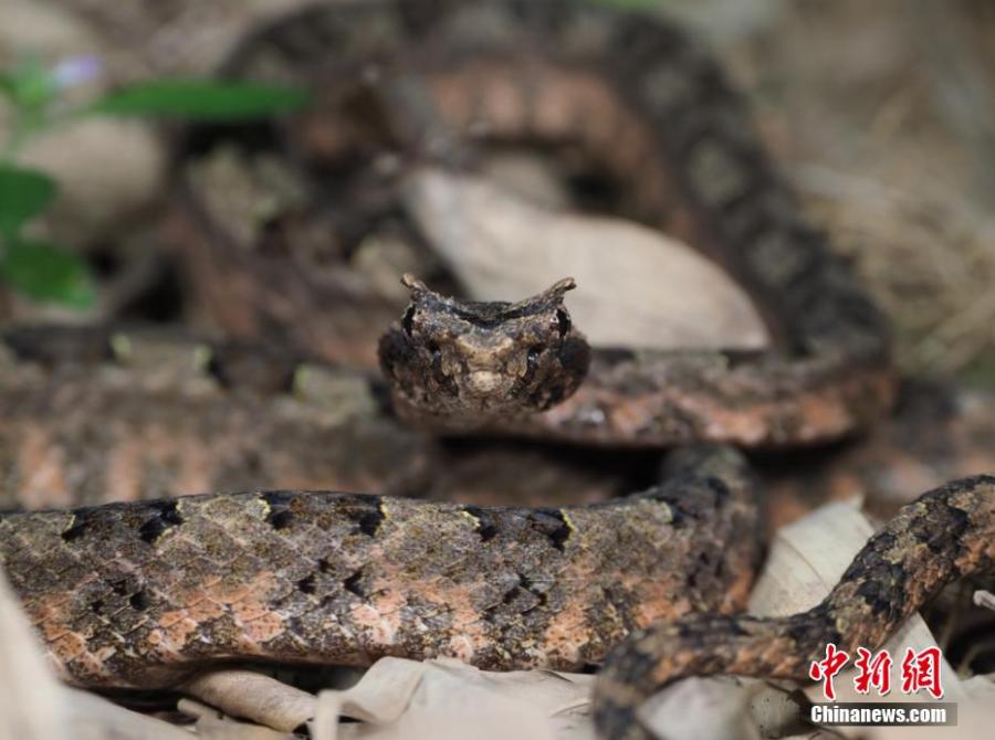 Photo shows horned pit viper in Wuyanling National Nature Reserve, east China's Zhejiang Province. (Photo provided by Wuyanling National Nature Reserve management center)