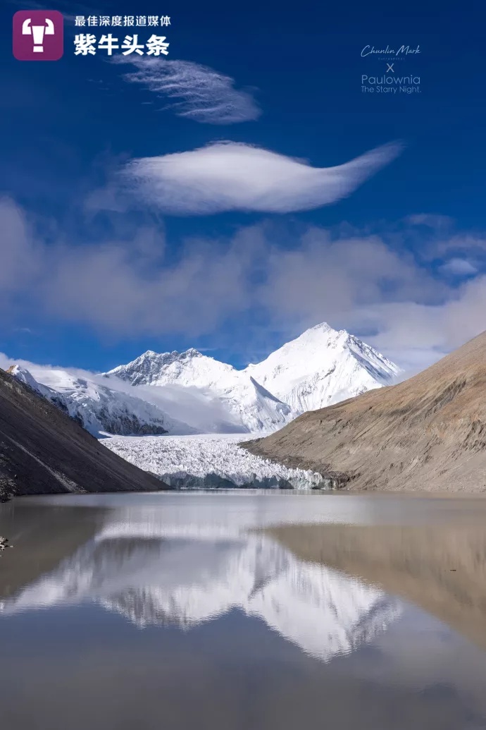 The two photographers arrived at the mountain by following the same path taken by the English mountaineer and explorer George Mallory, who had died on one of his ascents of Mount Qomolangma. They arrived at a place called the Kada Valley, which has an elevation of 5,700 meters and sits to the east of Mount Qomolangma, using it as a safe platform where they could admire the mountain. Seen from this angle, the magnificent mountain appeared like a massive pyramid.