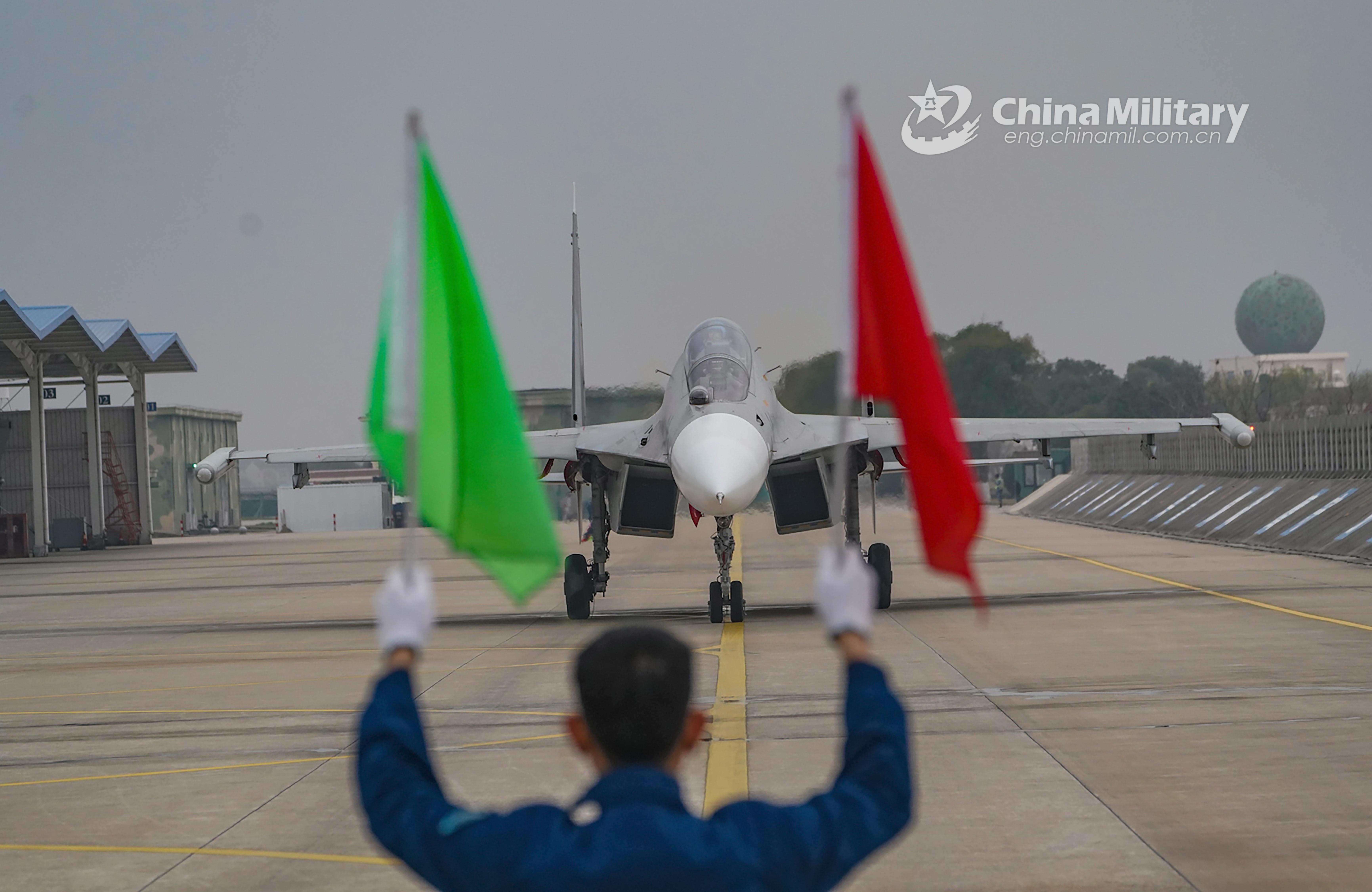 A ground crew member assigned to a naval aviation brigade under the PLA Eastern Theater Command uses flag signal to guide a fighter jet into the aircraft hangar after a flight training mission on December 16, 2021. (eng.chinamil.com.cn/Photo by Tian Jianmin)