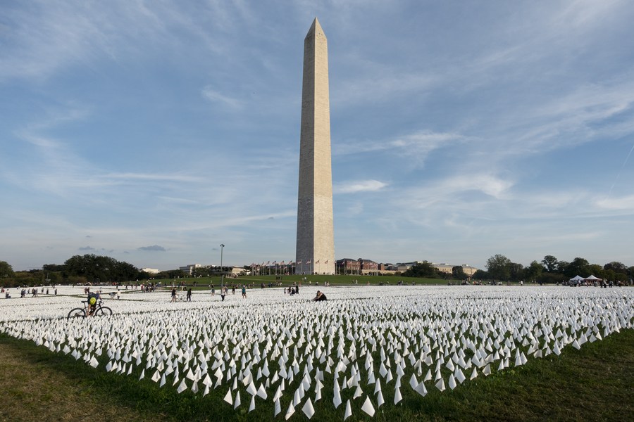 White flags honoring the lives lost to COVID-19 are seen on the National Mall in Washington, D.C., the United States, on Oct. 2, 2021. (Xinhua/Liu Jie)