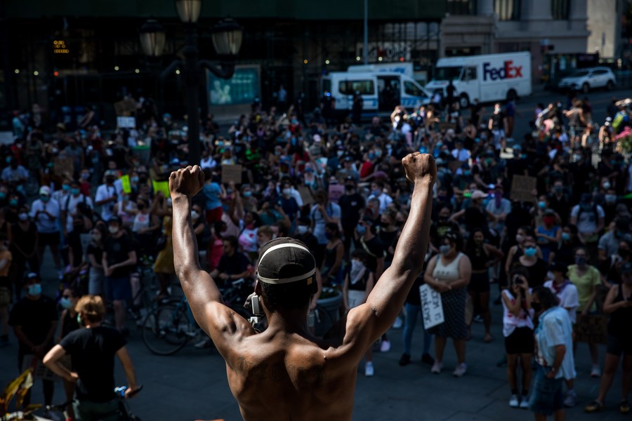 People take part in a "Black Lives Matter" protest commemorating Juneteenth in the Brooklyn borough of New York, the United States, June 19, 2020. (Photo by Michael Nagle/Xinhua)