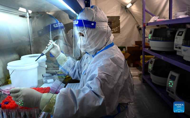 A medical worker works at the air-inflated testing lab for COVID-19 nucleic acid testing in Xi'an, northwest China's Shaanxi Province, Dec. 23, 2021. (Xinhua/Liu Xiao)