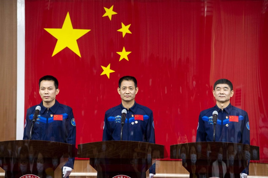 Chinese astronauts Nie Haisheng (C), Liu Boming (R) and Tang Hongbo for the Shenzhou-12 mission meet the press at the Jiuquan Satellite Launch Center in northwest China, June 16, 2021. (Photo by Weng Qiyu/People’s Daily Online)