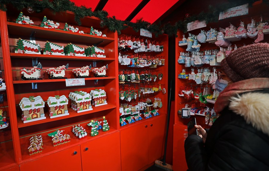 A woman views Christmas ornaments made in China in a Christmas market at Trafalgar Square in London, Britain, Dec. 23, 2021. (Xinhua/Li Ying)