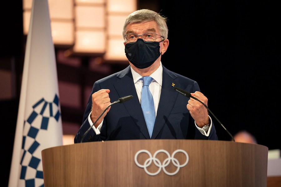 International Olympic Committee (IOC) President Thomas Bach speaks during the 138th IOC Session in Tokyo, Japan, on July 20, 2021, during which the move of adding "together" into the Olympic motto of "faster, higher, stronger" was unanimously approved. (IOC/Handout via Xinhua)