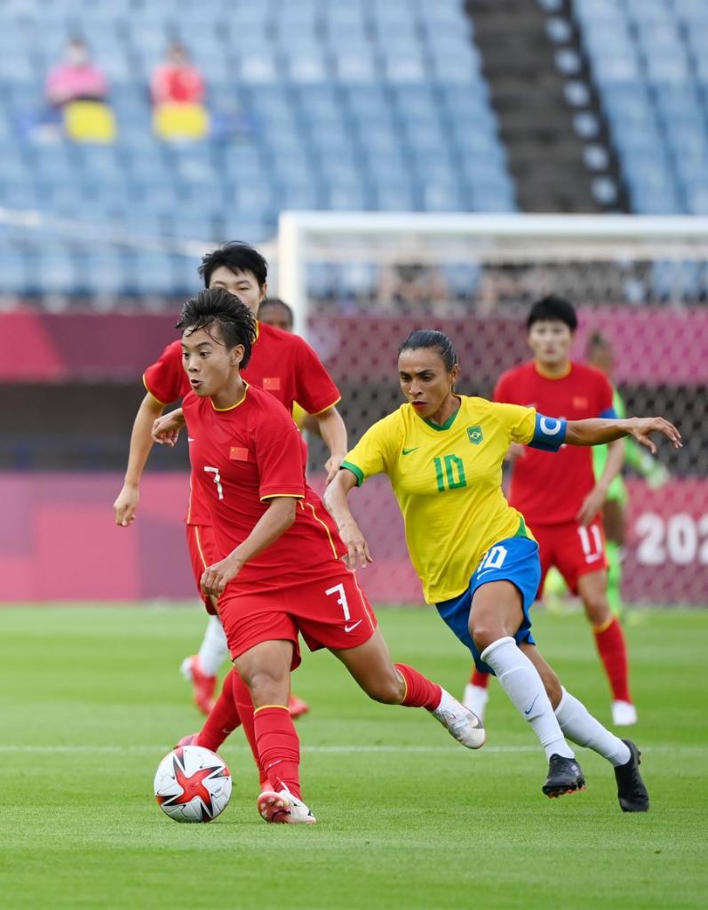 Wang Shuang (L) of China vies with Marta of Brazil during Tokyo 2020 women's football group F match in Miyagi, Japan, July 21, 2021. (Xinhua/Lu Yang)