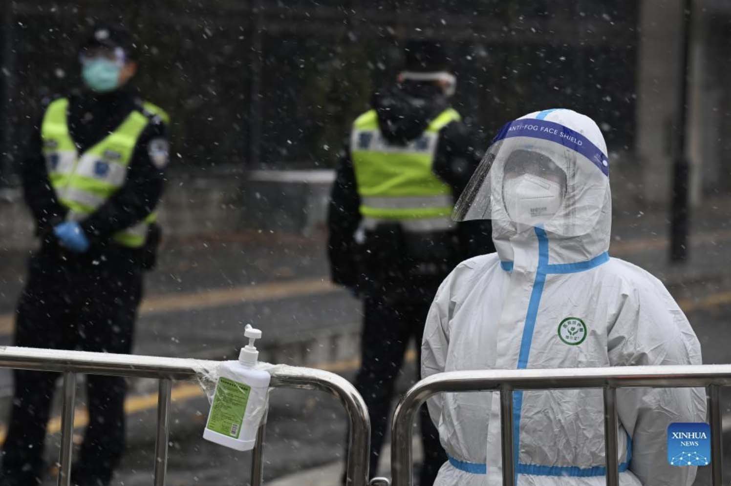 A medical worker is on duty amid snow in Xi'an, northwest China's Shaanxi Province, Dec. 25, 2021. Xi'an imposed closed-off management for communities and villages on Thursday in an effort to curb the spread of the latest COVID-19 resurgence. More than 3,000 nucleic acid testing sites in Xi'an are working simultaneously to provide services for residents in communities and on roadsides. Tens of thousands of frontline workers and volunteers are working against the clock to contain the virus. To swiftly contain the spread of the virus, local authorities have rolled out urgent measures while ensuring the city's residents have access to daily necessities. (Xinhua/Tao Ming)