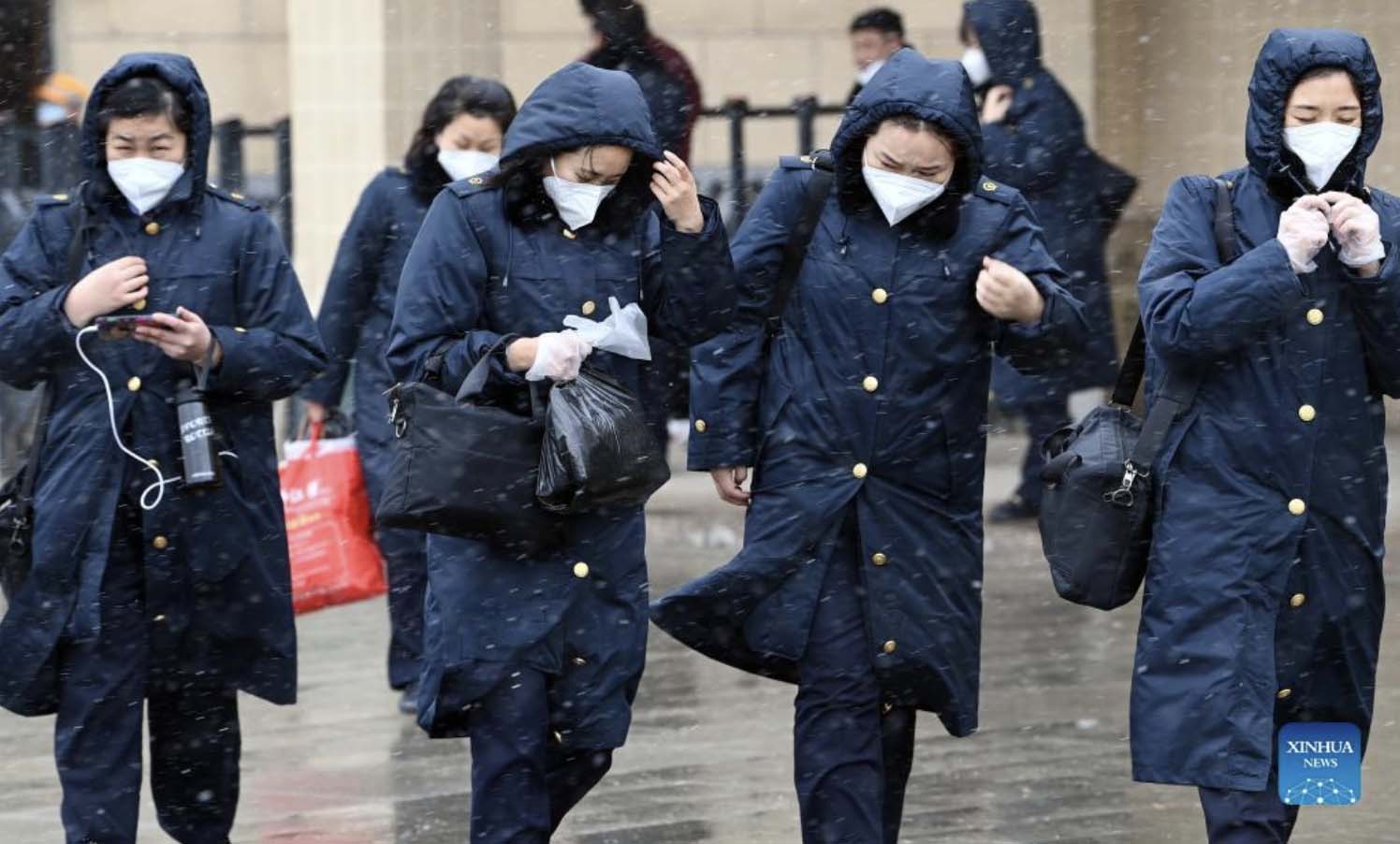 Railway crew go to work amid snow in Xi'an, northwest China's Shaanxi Province, Dec. 25, 2021. Xi'an imposed closed-off management for communities and villages on Thursday in an effort to curb the spread of the latest COVID-19 resurgence. More than 3,000 nucleic acid testing sites in Xi'an are working simultaneously to provide services for residents in communities and on roadsides. Tens of thousands of frontline workers and volunteers are working against the clock to contain the virus. To swiftly contain the spread of the virus, local authorities have rolled out urgent measures while ensuring the city's residents have access to daily necessities. (Xinhua/Tao Ming)