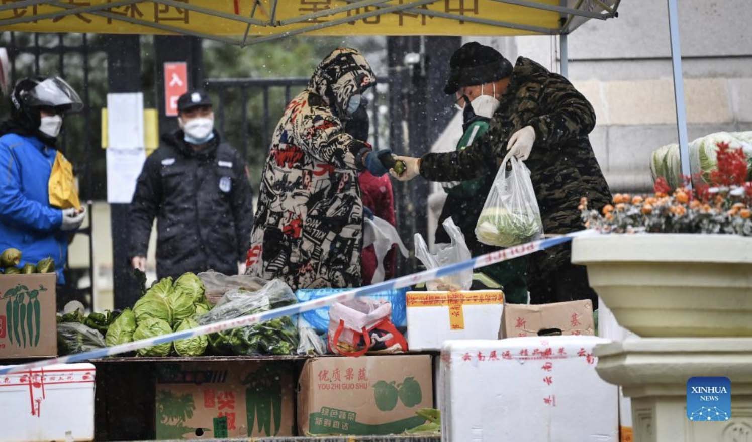 A vegetable market is set up at the entrance of a residential area under quarantine in Xi'an, northwest China's Shaanxi Province, Dec. 25, 2021. Xi'an imposed closed-off management for communities and villages on Thursday in an effort to curb the spread of the latest COVID-19 resurgence. More than 3,000 nucleic acid testing sites in Xi'an are working simultaneously to provide services for residents in communities and on roadsides. Tens of thousands of frontline workers and volunteers are working against the clock to contain the virus. To swiftly contain the spread of the virus, local authorities have rolled out urgent measures while ensuring the city's residents have access to daily necessities. (Xinhua/Tao Ming)
