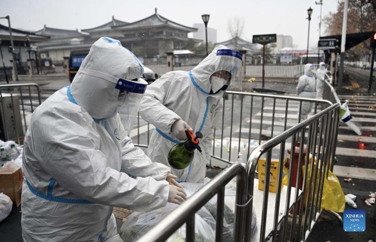 Staff members disinfect packed vegetables at a residential area under quarantine in Xi'an, northwest China's Shaanxi Province, Dec. 25, 2021. Xi'an imposed closed-off management for communities and villages on Thursday in an effort to curb the spread of the latest COVID-19 resurgence. More than 3,000 nucleic acid testing sites in Xi'an are working simultaneously to provide services for residents in communities and on roadsides. Tens of thousands of frontline workers and volunteers are working against the clock to contain the virus. To swiftly contain the spread of the virus, local authorities have rolled out urgent measures while ensuring the city's residents have access to daily necessities. (Xinhua/Tao Ming)