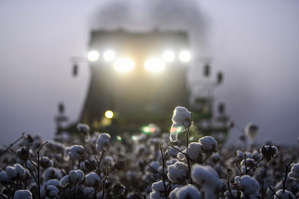 A cotton picker works in one of farmer Erkin Rehim's fields in Yuli County, northwest China's Xinjiang Uygur Autonomous Region, Oct. 24, 2021. (Xinhua/Zhao Ge)
