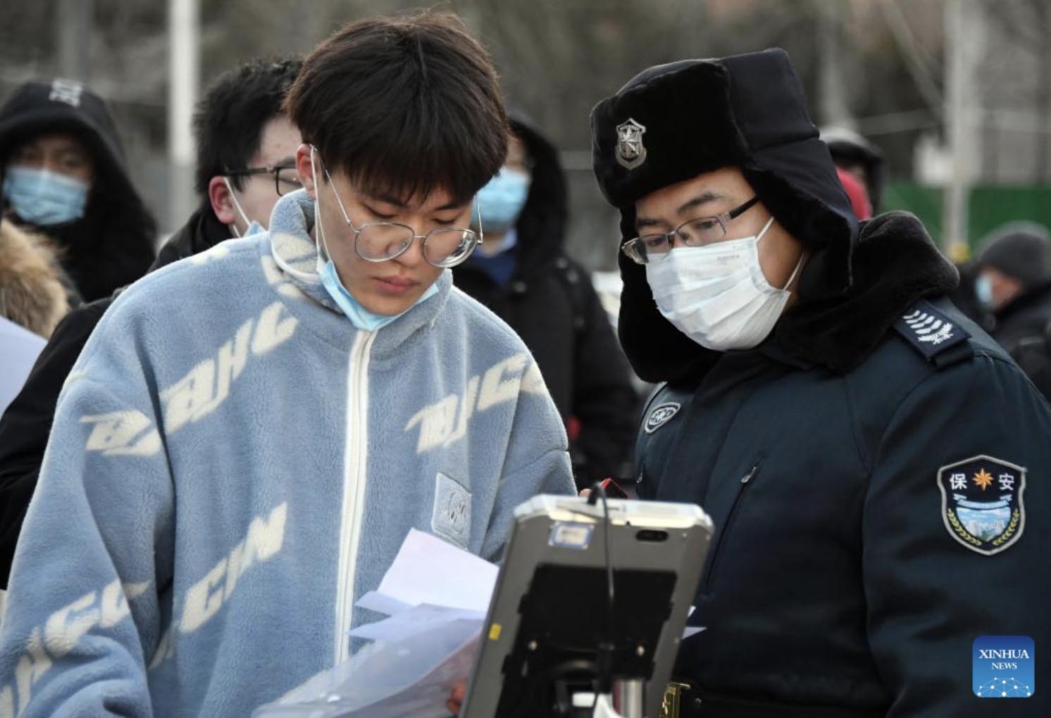 A staff member (R) uses the facial recognition system to check the information of an examinee for postgraduate entrance exams in Beijing Institute of Technology in Beijing, capital of China, Dec. 25, 2021. China's 2022 national entrance exams for postgraduate studies kicked off on Saturday. (Xinhua/Ren Chao)