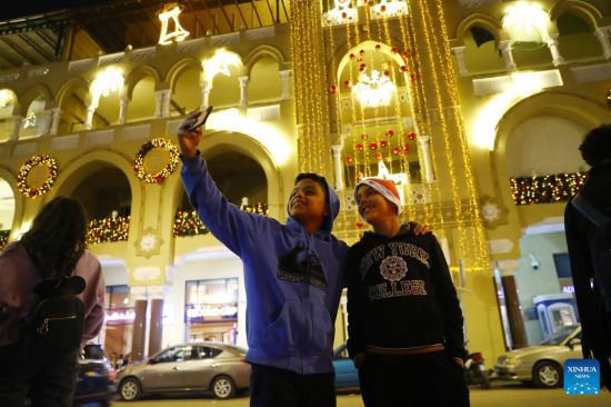 People take photos in front of a building with Christmas decorations in Cairo, Egypt, on Dec. 25, 2021. (Xinhua/Ahmed Gomaa)