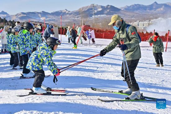 An instructor teaches a kid to ski at a ski resort in Qingzhou City, east China's Shandong Province, Dec. 25, 2021. (Photo by Wang Jilin/Xinhua)