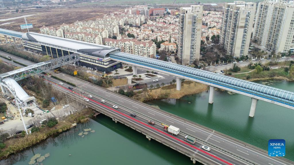 Aerial photo taken on Dec. 26, 2021 shows the Guizihu Station of the Metro Line 16 in Wuhan, central China's Hubei Province. Three urban rail lines in Wuhan opened to the public on Sunday - Line 5, the second phase of Line 6, and Line 16 (Hannan), boasting a total length of 75.2 km. Line 5 is Wuhan's first fully automated metro line. Line 16 is built along the Yangtze River, with the highest station standing at 30 meters, offering passengers a nice view. The total length of metro rails in operation in Wuhan has reached 435 km. (Photo by Wu Zhizun/Xinhua)