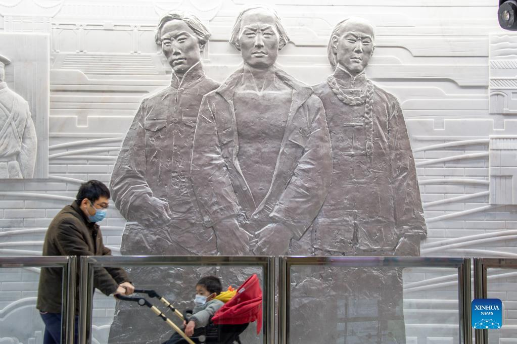 Passengers walk past an embossment at the Pengliuyang Station of the Metro Line 5 in Wuhan, central China's Hubei Province, Dec. 26, 2021. Three urban rail lines in Wuhan opened to the public on Sunday - Line 5, the second phase of Line 6, and Line 16 (Hannan), boasting a total length of 75.2 km. Line 5 is Wuhan's first fully automated metro line. Line 16 is built along the Yangtze River, with the highest station standing at 30 meters, offering passengers a nice view. The total length of metro rails in operation in Wuhan has reached 435 km. (Photo by Wu Zhizun/Xinhua)