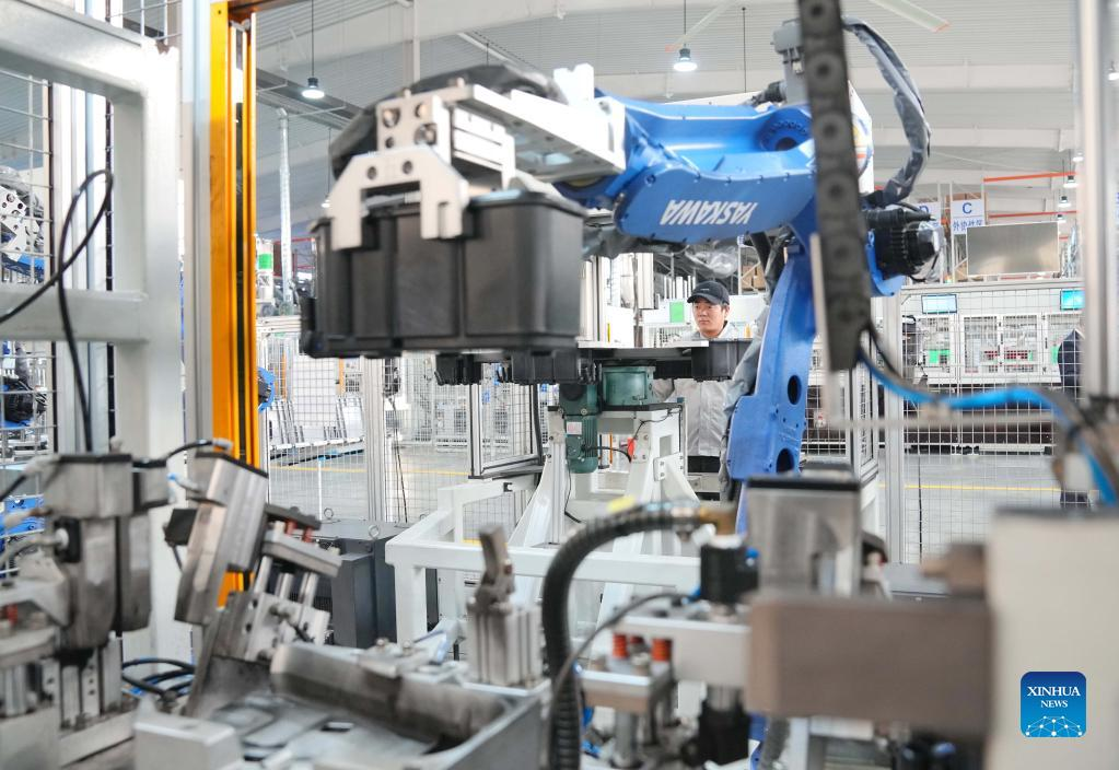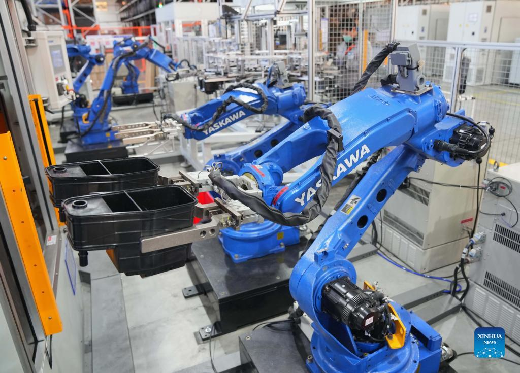 Robots work at the workshop of an auto parts manufacturing company in the Langfang Economic and Technological Development Zone of Langfang City, north China's Hebei Province, Dec. 25, 2021. The revenue of enterprises above designated size in the zone have reached 41.6 billion yuan (about 6.5 billion U.S. dollars) from January to November this year, a year-on-year increase of 7.92 percent. (Xinhua/Yang Shiyao)