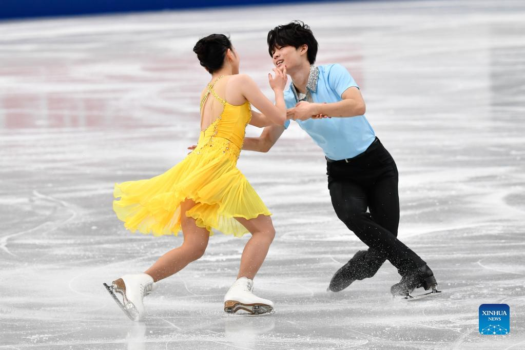 Takanami Ayumi (L) and Nishiyama Shingo of Japan compete during the ice dance competition at the All-Japan Figure Skating Championships held in Saitama, Japan, Dec. 25, 2021. (Xinhua/Zhang Xiaoyu)