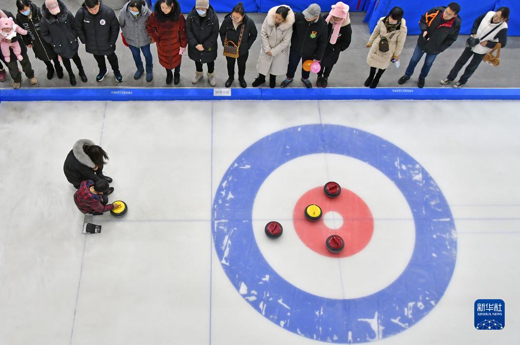 Photo taken on Dec. 26, 2021 shows people experience curling in Yantai, east China's Shandong Province. Winter sports participation is in full swing as the Beijing 2022 Winter Olympic Games approach.(Xinhua/Sun Wentan)