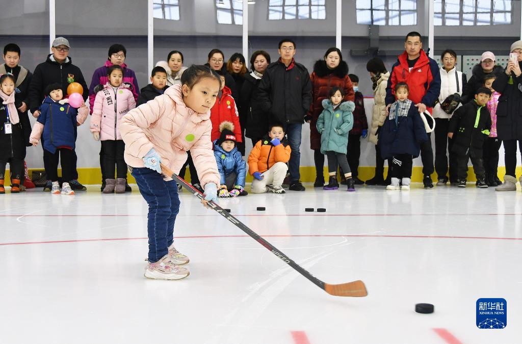 Photo taken on Dec. 26, 2021 shows a girl playing ice hockey in Yantai City, east China's Shandong Province. Winter sports participation is in full swing as the Beijing 2022 Winter Olympic Games approach. (Xinhua/Sun Wentan)