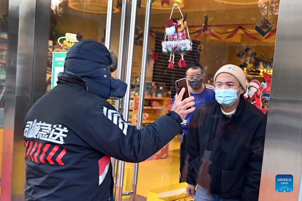 A deliveryman prepares to collect goods in Xi'an, northwest China's Shaanxi Province, Dec. 26, 2021. Xi'an imposed closed-off management for communities and villages last Thursday to curb the spread of the latest COVID-19 resurgence. (Xinhua/Tao Ming)