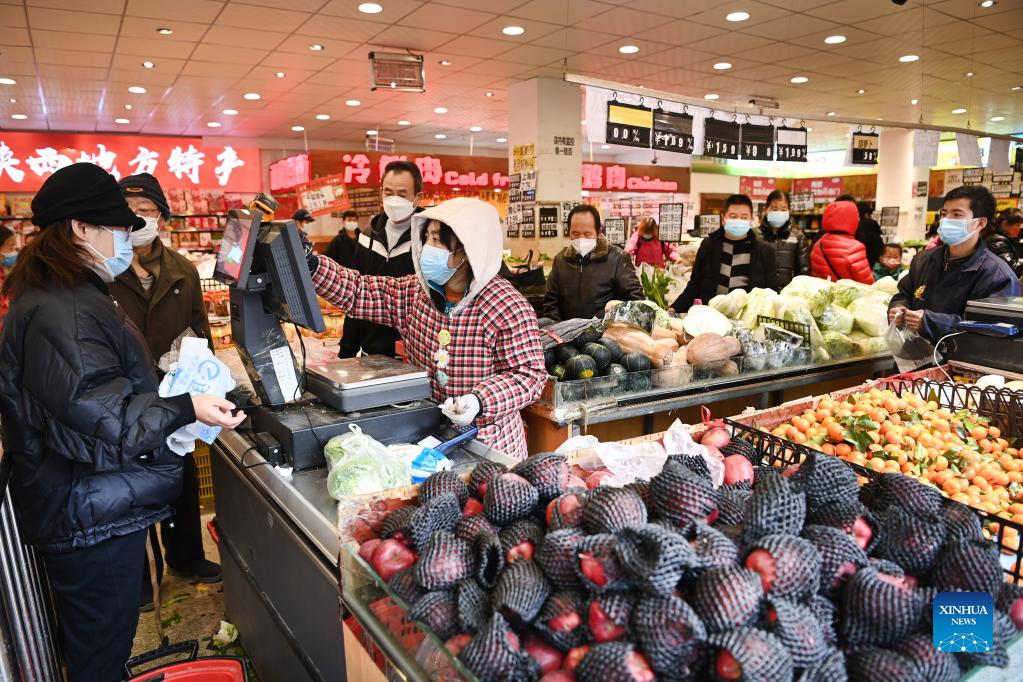 Citizens buy vegetables and fruits at a supermarket in Xi'an, northwest China's Shaanxi Province, Dec. 26, 2021. Xi'an imposed closed-off management for communities and villages last Thursday to curb the spread of the latest COVID-19 resurgence. (Xinhua/Tao Ming)