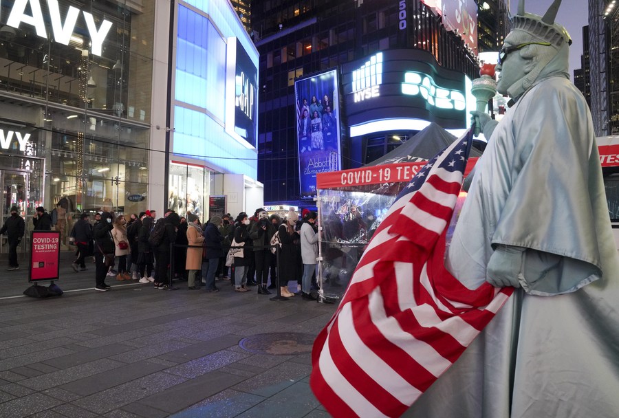 People line up for COVID-19 tests while a street performer waits for customer next to the mobile COVID-19 testing site on Times Square in New York, the United States, Dec. 20, 2021. (Xinhua/Wang Ying)