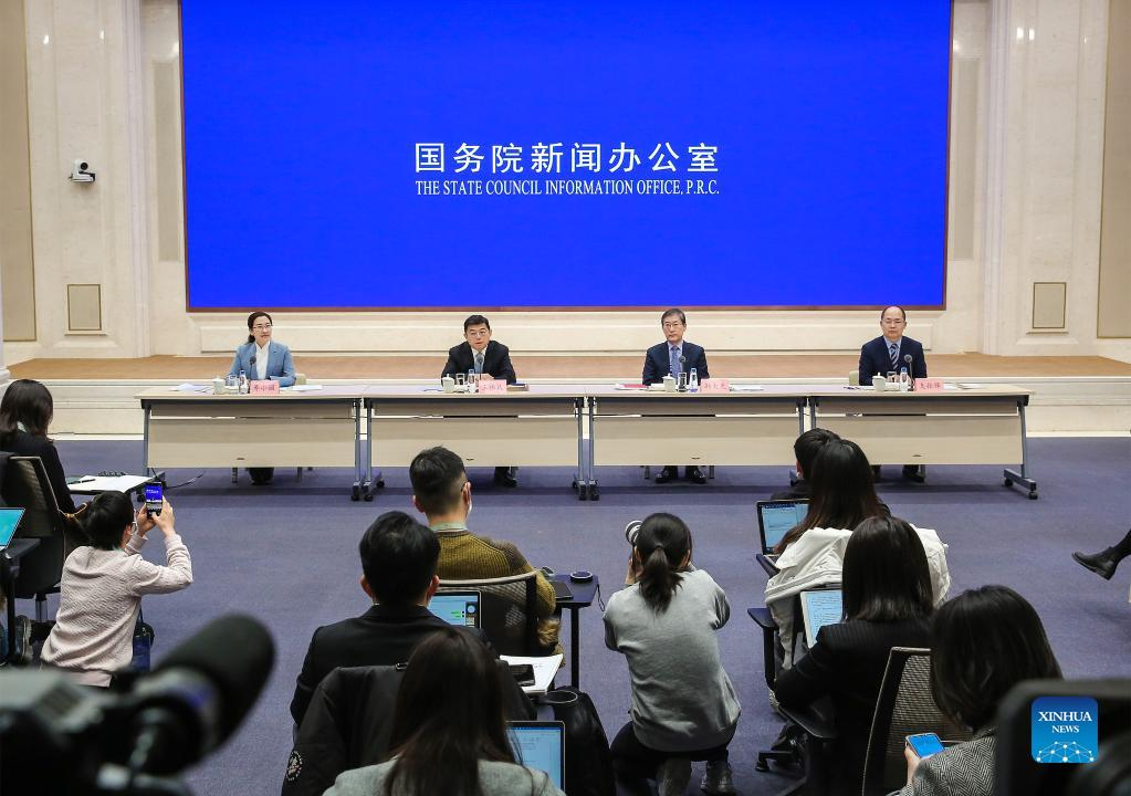 Wang Zhenmi (2nd L), head of the Center for Hong Kong and Macao Studies at Tsinghua University, Han Dayuan (2nd R), professor at the Renmin University of China, and Zhi Zhenfeng (1st R), a researcher with the Institute of Law of the Chinese Academy of Social Sciences, attend a briefing on a white paper on Hong Kong's democratic progress in Beijing, capital of China, Dec. 27, 2021. The white paper, titled "Hong Kong: Democratic Progress Under the Framework of One Country, Two Systems," was released by China's State Council Information Office on Dec. 20. (Photo by Liu Jian/Xinhua)