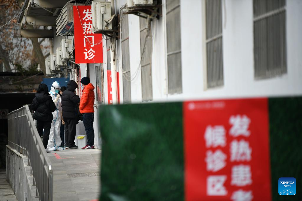 A medical worker receives patients at the fever clinic of the 1st Affiliated Hospital of Xi'an Jiaotong University in Xi'an, northwest China's Shaanxi Province, Dec. 27, 2021. Two hospitals affiliated to Xi'an Jiaotong University have resumed outpatient and emergency services with strict epidemic prevention and control measures, as the city is coping with a recent resurgence of COVID-19. (Xinhua/Li Yibo)