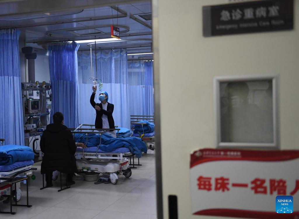 A medical worker gives an infusion to a patient at the 1st Affiliated Hospital of Xi'an Jiaotong University in Xi'an, northwest China's Shaanxi Province, Dec. 27, 2021. Two hospitals affiliated to Xi'an Jiaotong University have resumed outpatient and emergency services with strict epidemic prevention and control measures, as the city is coping with a recent resurgence of COVID-19. (Xinhua/Li Yibo)
