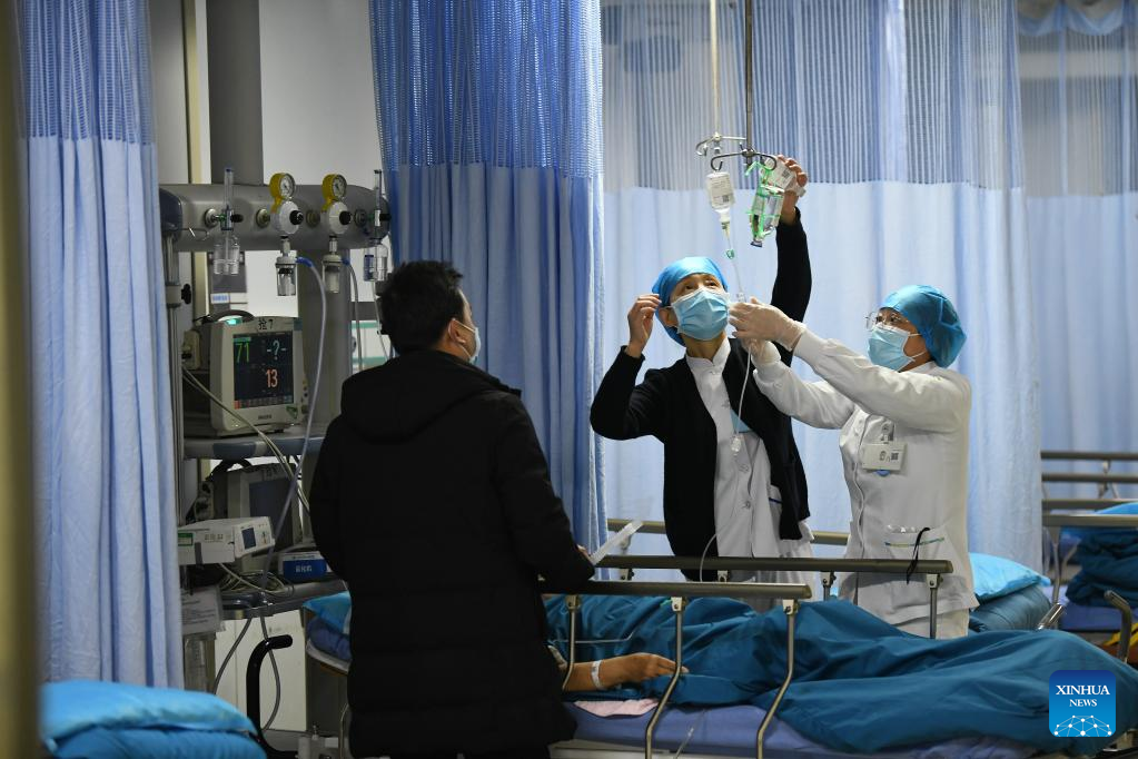 Medical staff give an infusion to a patient at the 1st Affiliated Hospital of Xi'an Jiaotong University in Xi'an, northwest China's Shaanxi Province, Dec. 27, 2021. Two hospitals affiliated to Xi'an Jiaotong University have resumed outpatient and emergency services with strict epidemic prevention and control measures, as the city is coping with a recent resurgence of COVID-19. (Xinhua/Li Yibo)