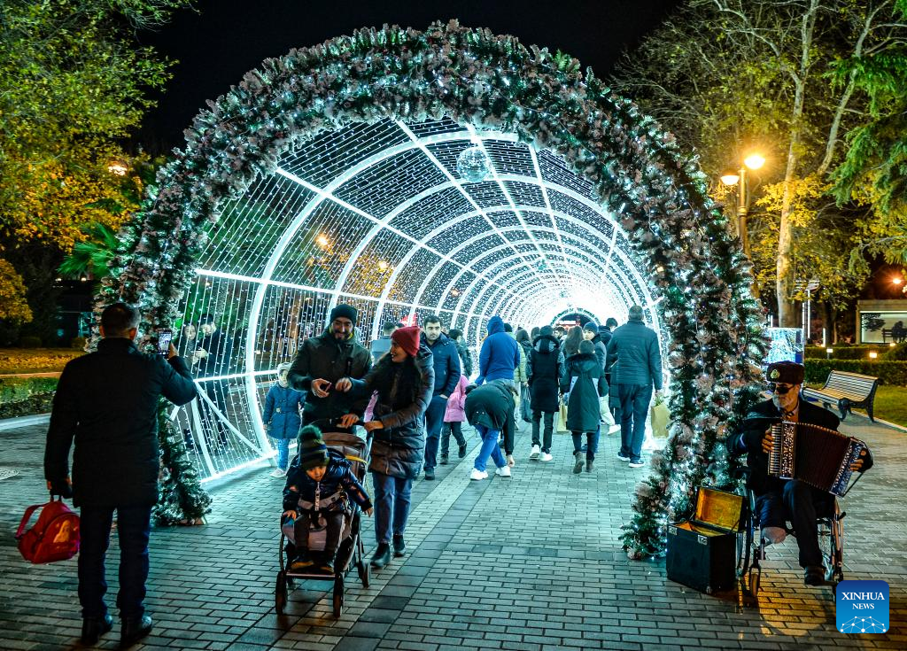 New Year lights and decorations are seen in the downtown area of Baku, Azerbaijan, on Dec. 25, 2021. (Photo by Tofik Babayev/Xinhua)