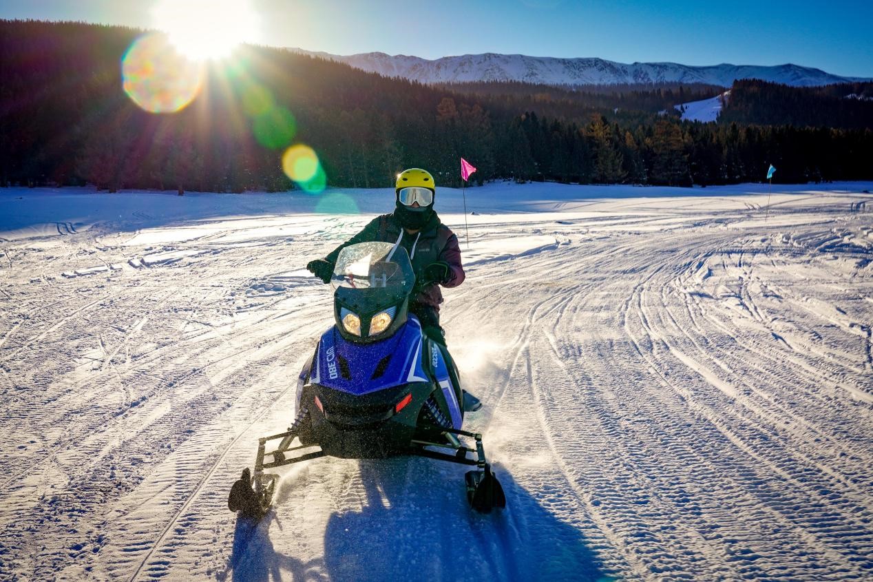 A tourist rides snowmobile at a ski resort in Hami city, northwest China’s Xinjiang Uygur autonomous region, Dec. 25, 2021. (People’s Daily Online/Li Hua)