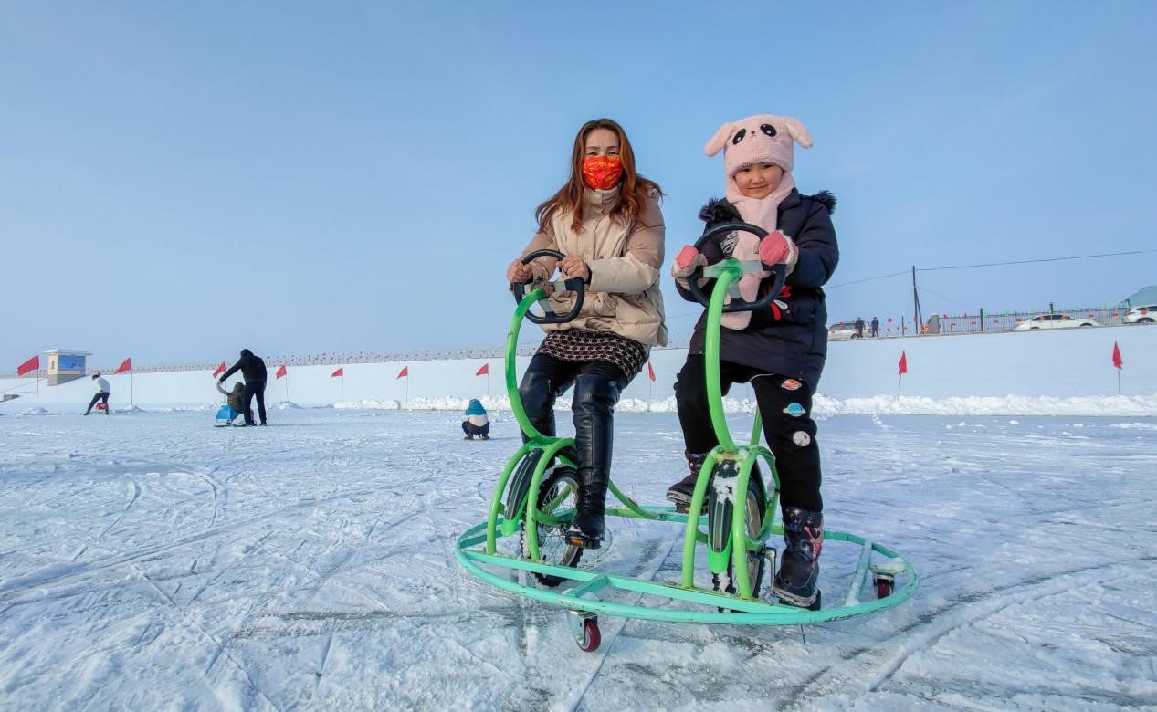 Tourists ride snow bicycles in Wugongtai township, Hutubi county, Changji Hui autonomous prefecture, northwest China’s Xinjiang Uygur autonomous region, Dec. 18, 2021. (People’s Daily Online/Tao Weiming)