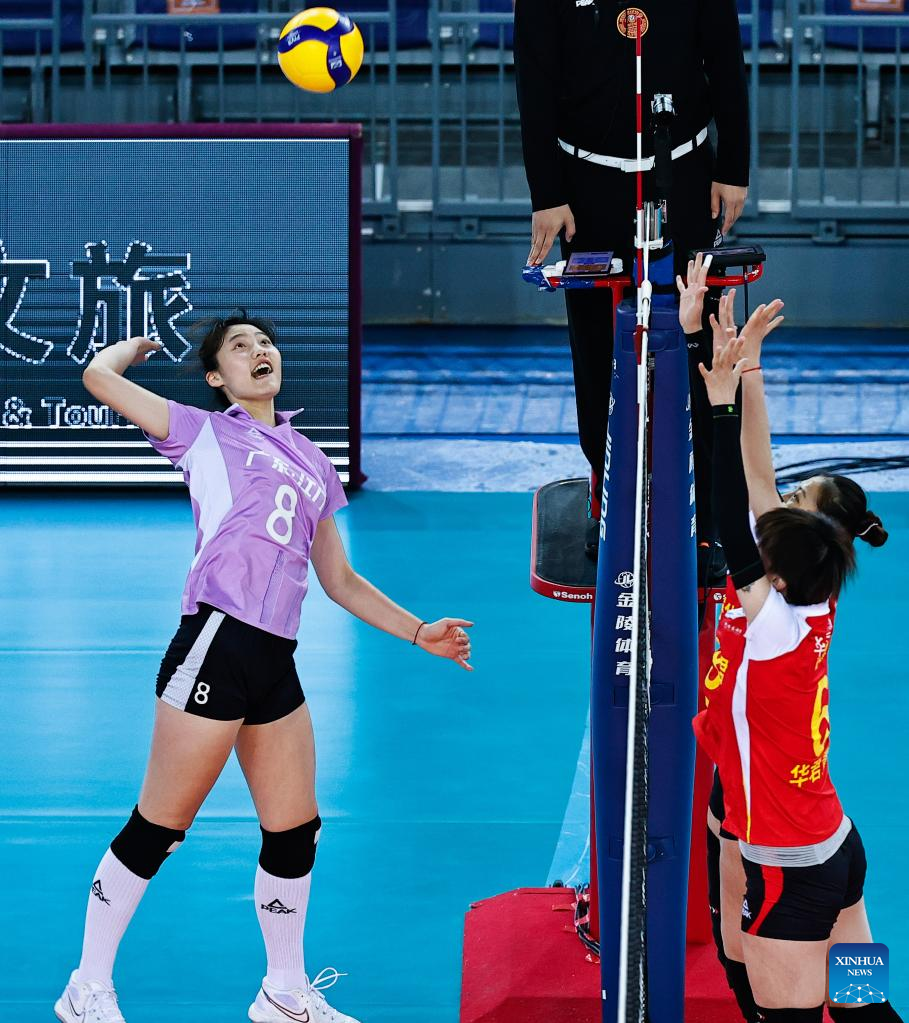 Wang Yifan (L) of Guangdong spikes during the Group E match between Liaoning and Guangdong at the second stage of the 2021-2022 season Chinese Women's Volleyball Super League in Jiangmen, south China's Guangdong Province, Dec. 27, 2021. (Xinhua/Yang Zhisen)