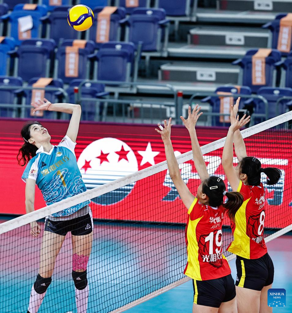 Li Yingying (L) of Tianjin spikes the ball during the Group E match between Tianjin and Shanghai at the second stage of the 2021-2022 season Chinese Women's Volleyball Super League in Jiangmen, south China's Guangdong Province, Dec. 27, 2021. (Xinhua/Yang Zhisen)