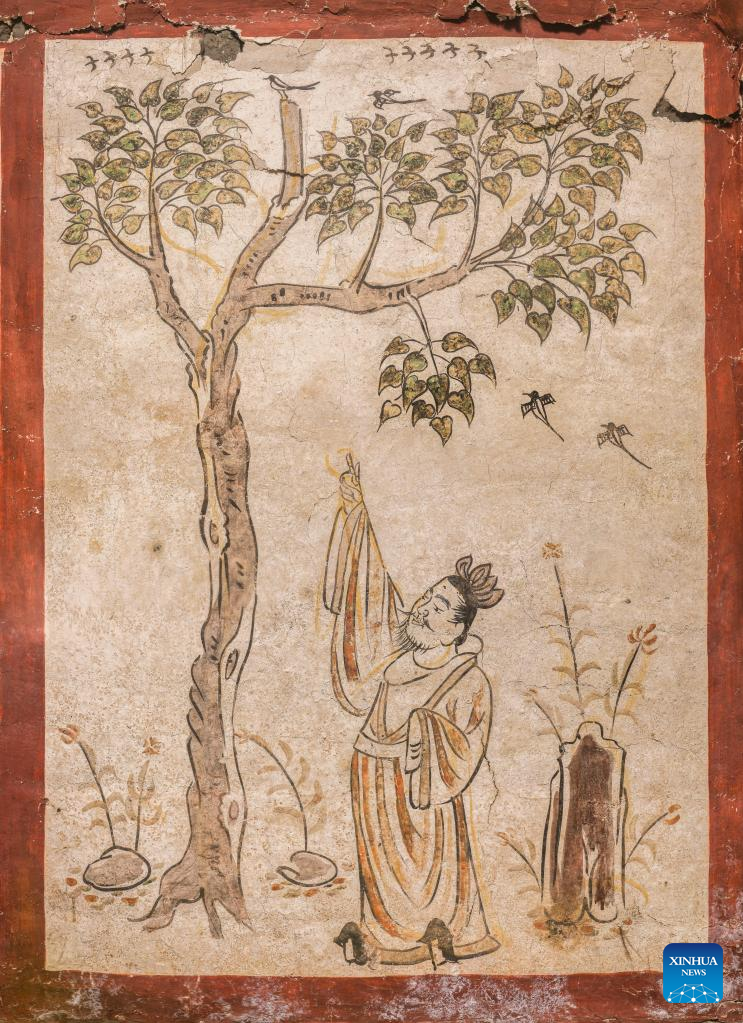 Undated file photo provided by Taiyuan Institute of Cultural Relics Protection shows a part of restored murals of an ancient tomb dating back to the Tang Dynasty (618-907) in Taiyuan, north China's Shanxi Province. The tomb was discovered in an elementary school in Taiyuan, capital of Shanxi, in 2019 and later moved to the museum for protection and restoration.Defects in the murals such as fissures, hollows and blemishes have been fixed, and the tomb will open to the public in the future, said the Taiyuan Northern Qi Dynasty Mural Museum.Interestingly, various figures in the mural paintings appear to be making "V" signs with their middle and index fingers. (Taiyuan Institute of Cultural Relics Protection/Handout via Xinhua)