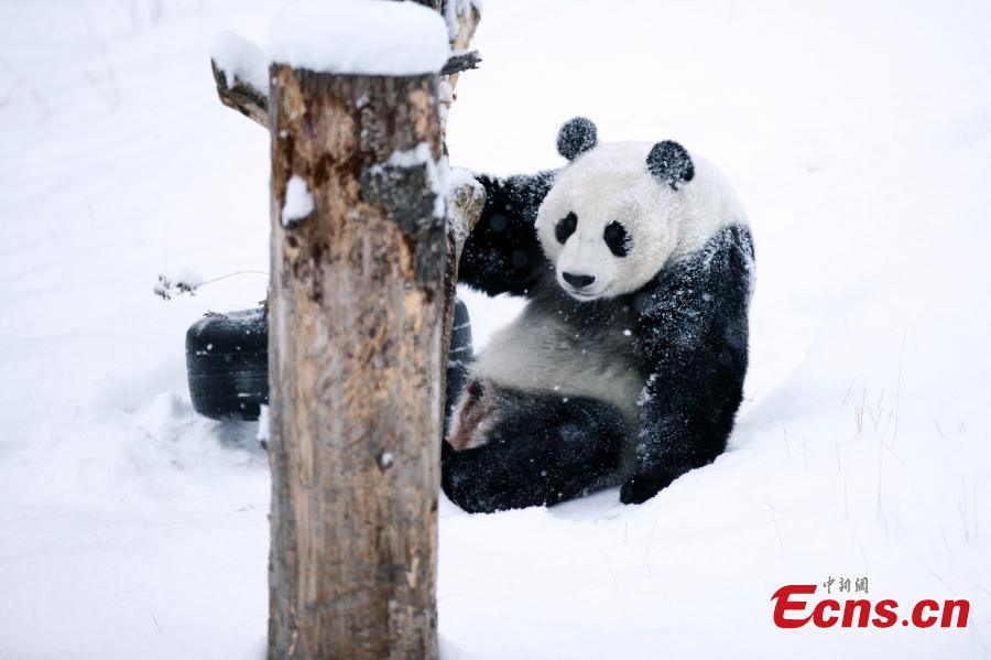 Giant panda Xiao Liwu, or “Little Gift”, enjoy itself outside the panda hall after snow at Jiuzhaigou County of Aba Tibetan and Qiang Autonomous Prefecture in southwest China's Sichuan Province, Dec 26, 2021. (Photo by He Shengshan)