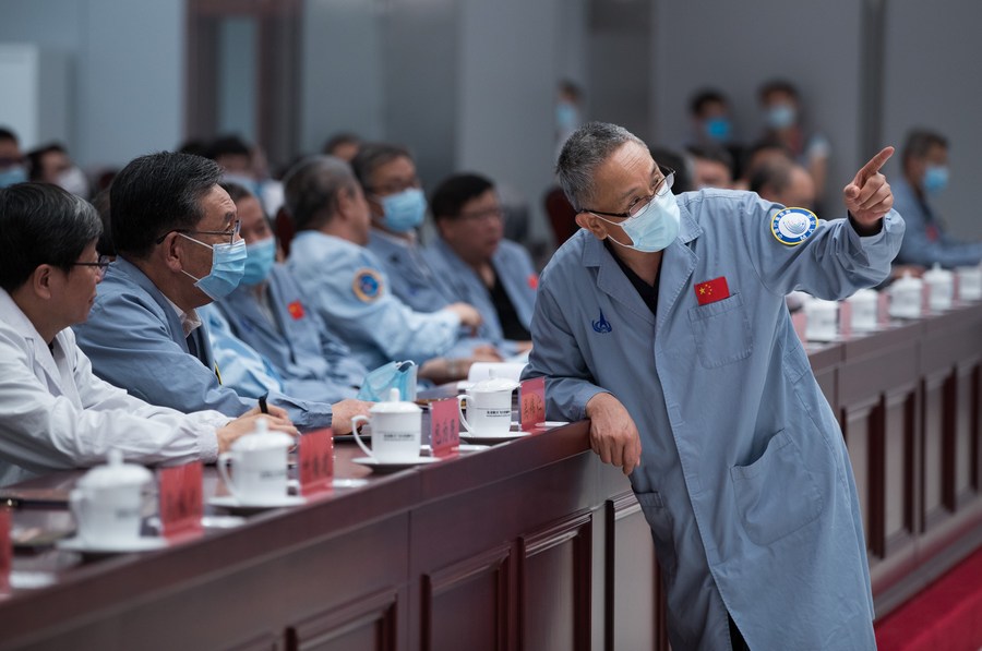 Zhang Rongqiao (R), chief designer of China's first Mars exploration mission, talks with Wu Weiren (2nd L), chief designer of China's lunar exploration project, at the Beijing Aerospace Control Center, after China's first Mars rover, Zhurong, drives down from its landing platform to the Martian surface, May 22, 2021. (Xinhua/Jin Liwang)