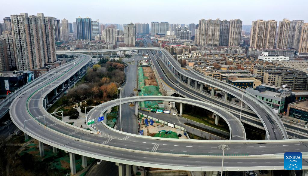 Aerial photo taken on Dec. 28, 2021 shows an empty overpass in Xi'an, northwest China's Shaanxi Province. Authorities in Xi'an have upgraded epidemic control and prevention measures starting Monday, ordering all residents to stay indoors and keep away from gatherings except when taking nucleic acid tests. (Xinhua/Tao Ming)
